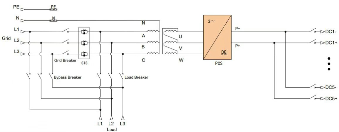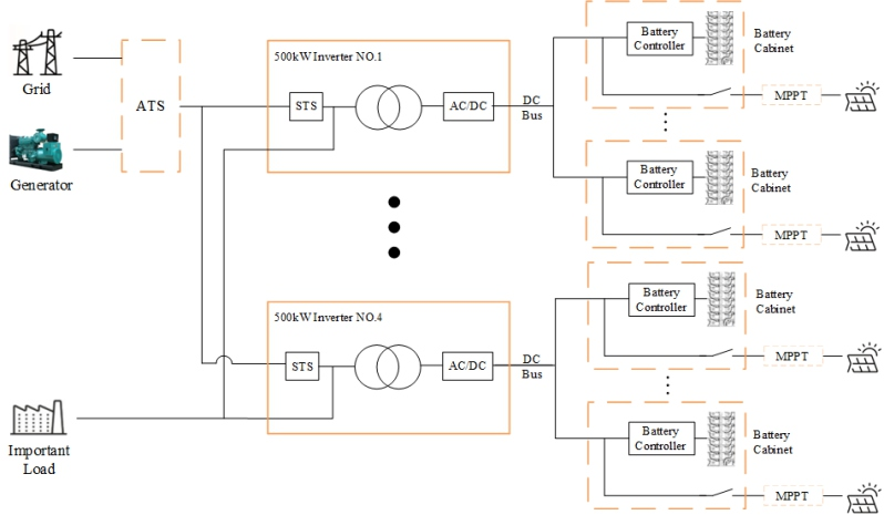 1.500 kW-tik gorako kargak, 500 kW-ko unitate bakarreko energia biltegiratze inbertsore bat erabiltzea gomendatzen da, lau konexio paralelo multzo onartzen dituena, 2 MW-ko potentzia osoa lortzeko;